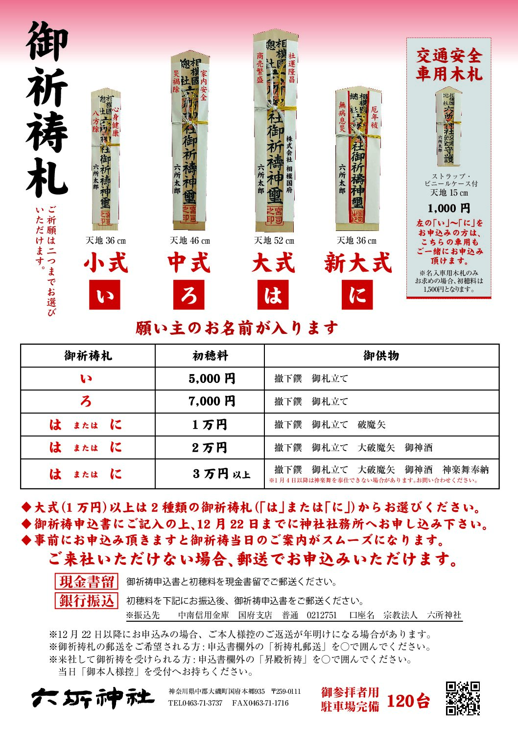 銀行振込: 初穂料を下記にお振込み後、御祈祷申込書をご郵送ください